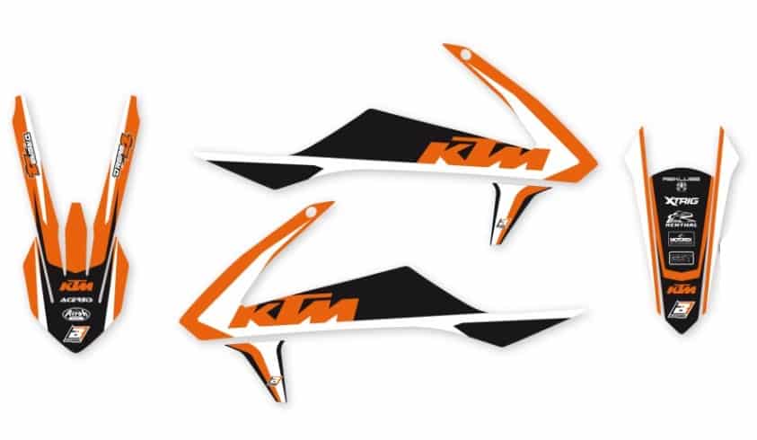Klistermærkesættet indeholder: tankpar, kølerskjoldpar, forskærm og bagskærm. De forskellige dele af sættet kan ikke sælges separat. Hullerne på tankklistermærkerne gør det muligt for benzindampene at komme ud. I tilfælde af slidte tanke er dette ikke nok til at forhindre nogle små løsrivelser.